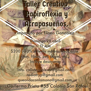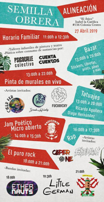 Pláticas de qué son las drogas y cómo funcionan y taller de papiroflexia con Eliseo además de varias intervenciones artísticas, venta de stickers y fanzines. Música en vivo.
