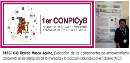 Participación en el 1er Congreso Nacional de Posgrado en Investigación Clínica y Básica, organizado por la Escuela Superior de Medicina IPN. Se expuso la charla titulada “Evaluación de los componentes del enriquecimiento ambiental en la alteración de la memoria y la adicción inducida por el tolueno”